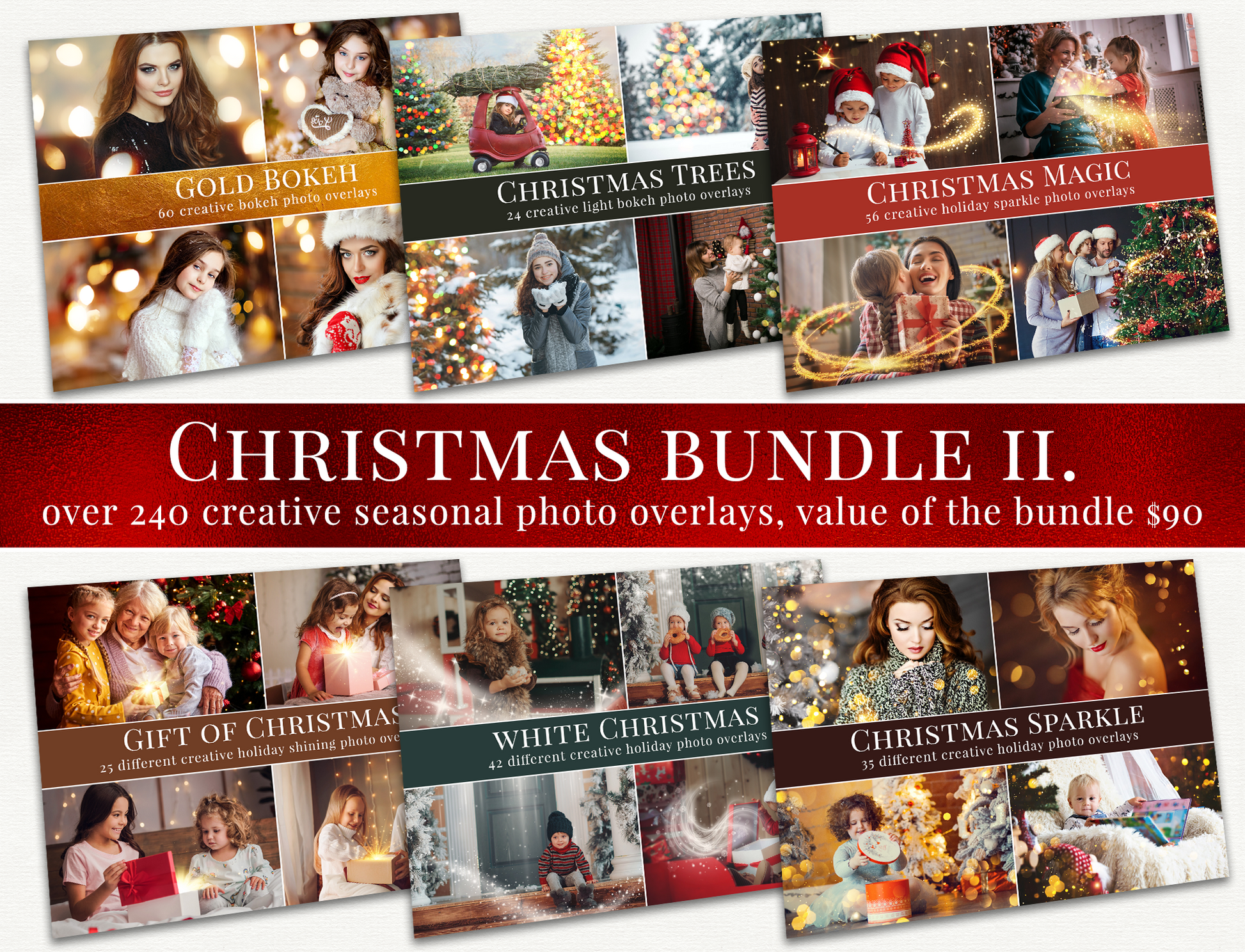 This Christmas Bundle II includes over 240 light and bokeh overlays for fast, creative holiday photo editing.
