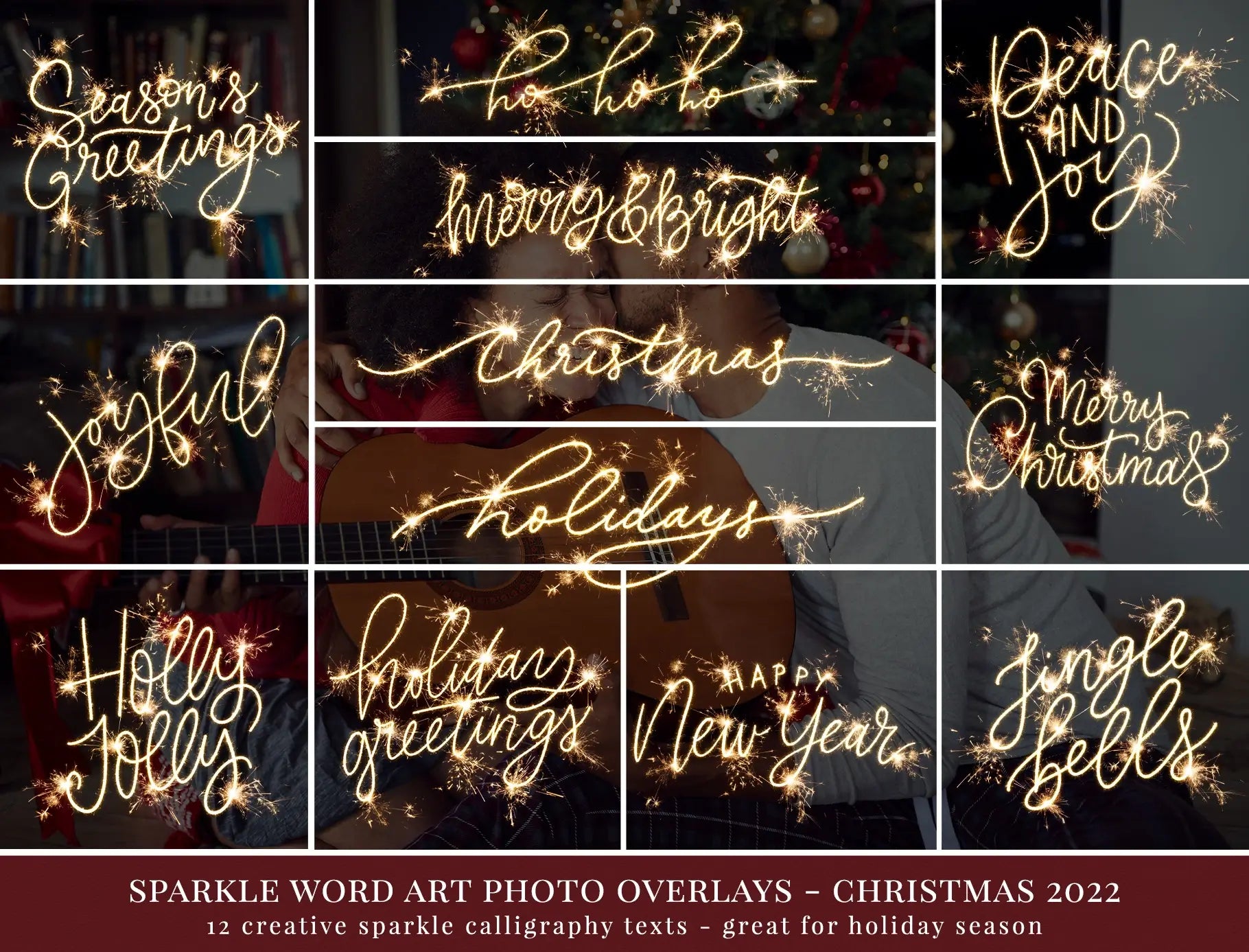Create festive, warm and magical holiday images with this beautiful collection of Christmas sparkle word art photo overlays designed especially for photographers.