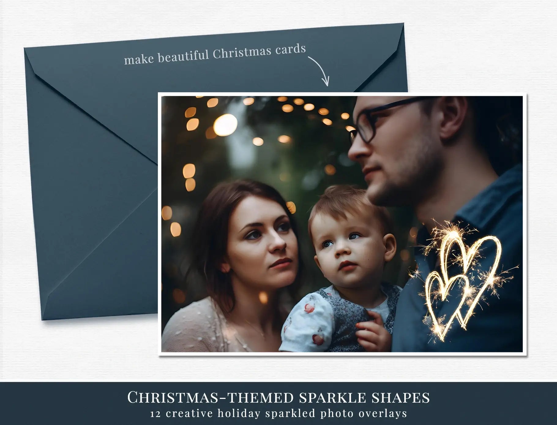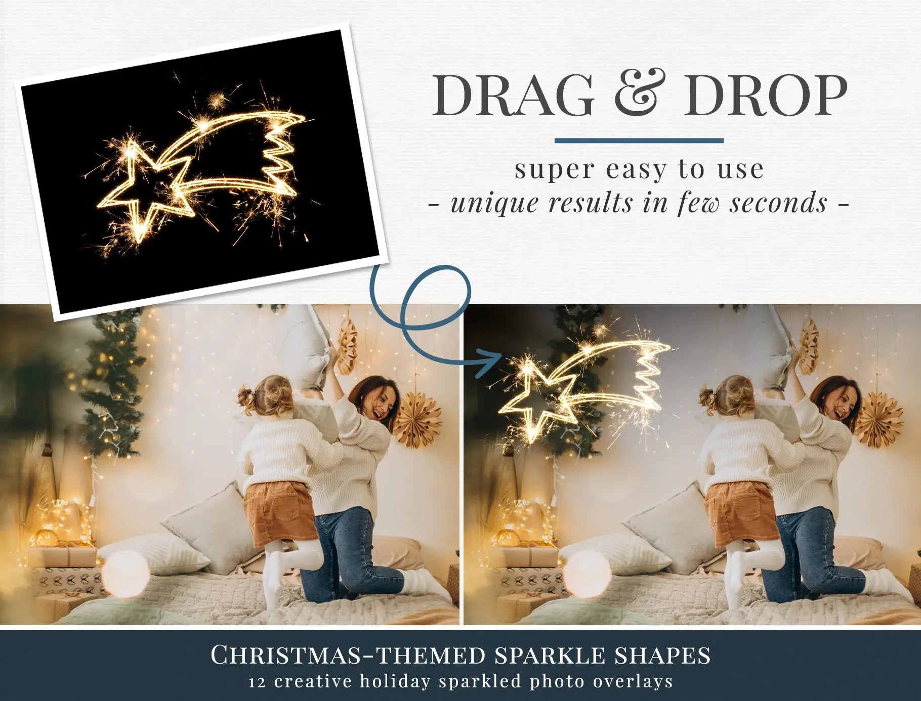 These creative sparkle shapes add decorative glowing elements that instantly bring Christmas atmosphere into your photos.