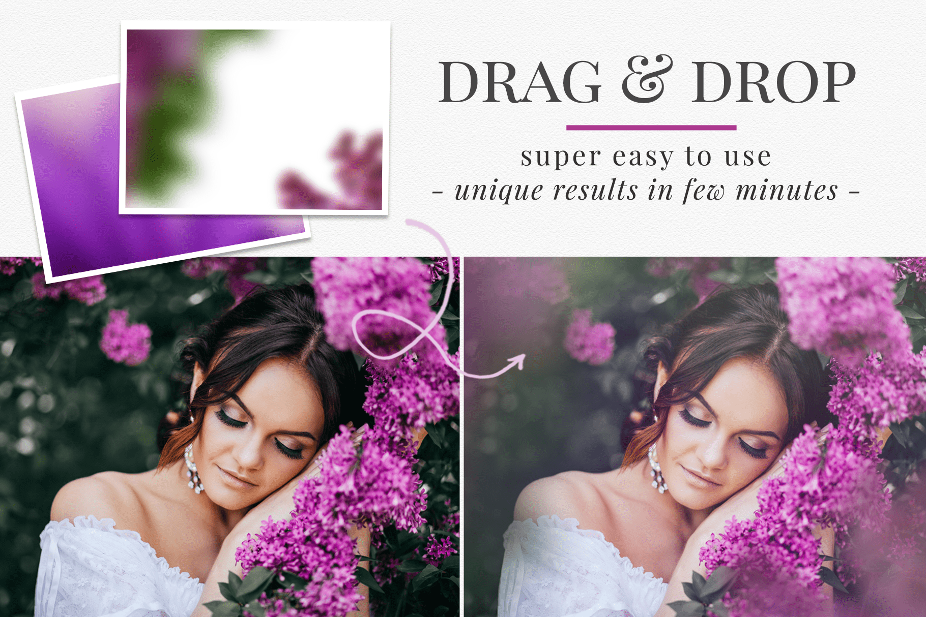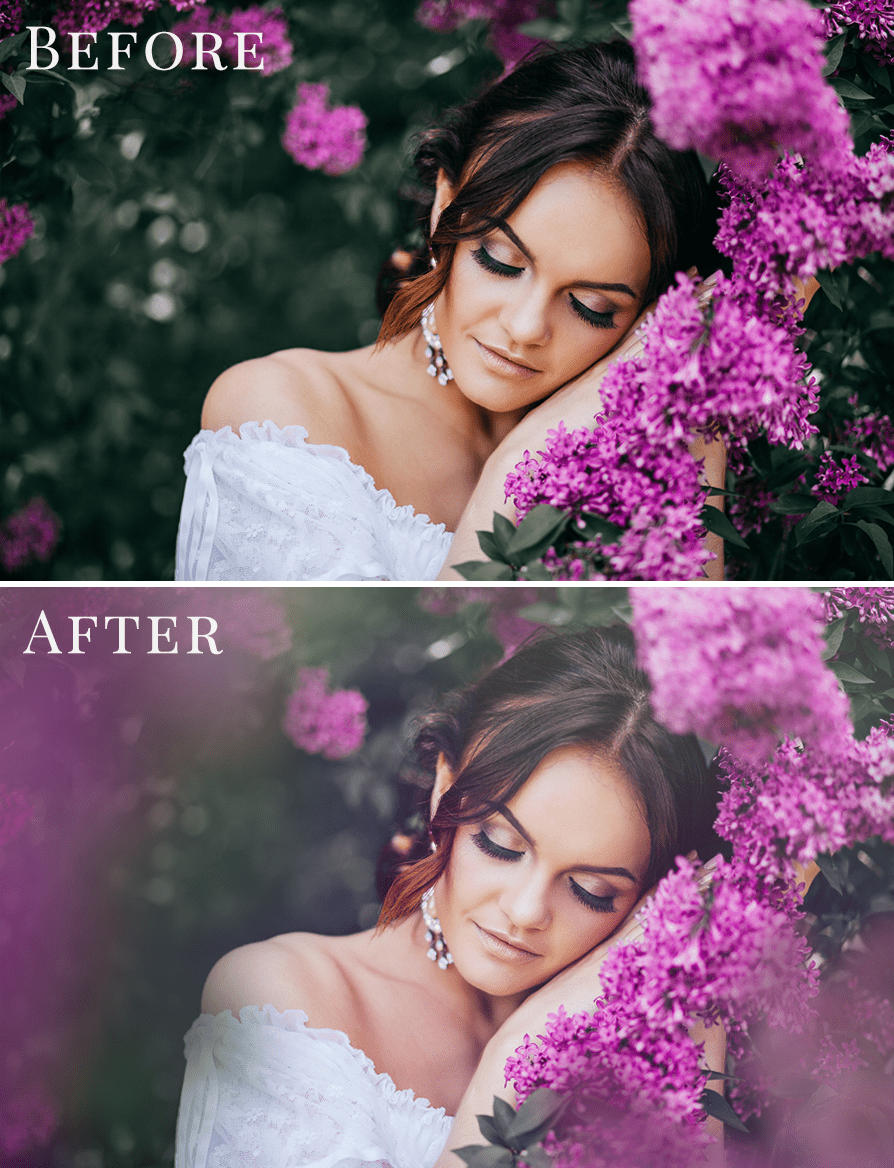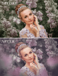 The lilac overlays bring calm spring atmosphere and pastel tones that work perfectly for outdoor portraits, family photography and fine art storytelling.