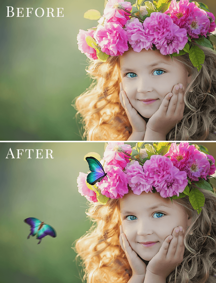 The butterflies blend naturally into images and allow you to build your own scene — from subtle accents to rich, whimsical compositions.