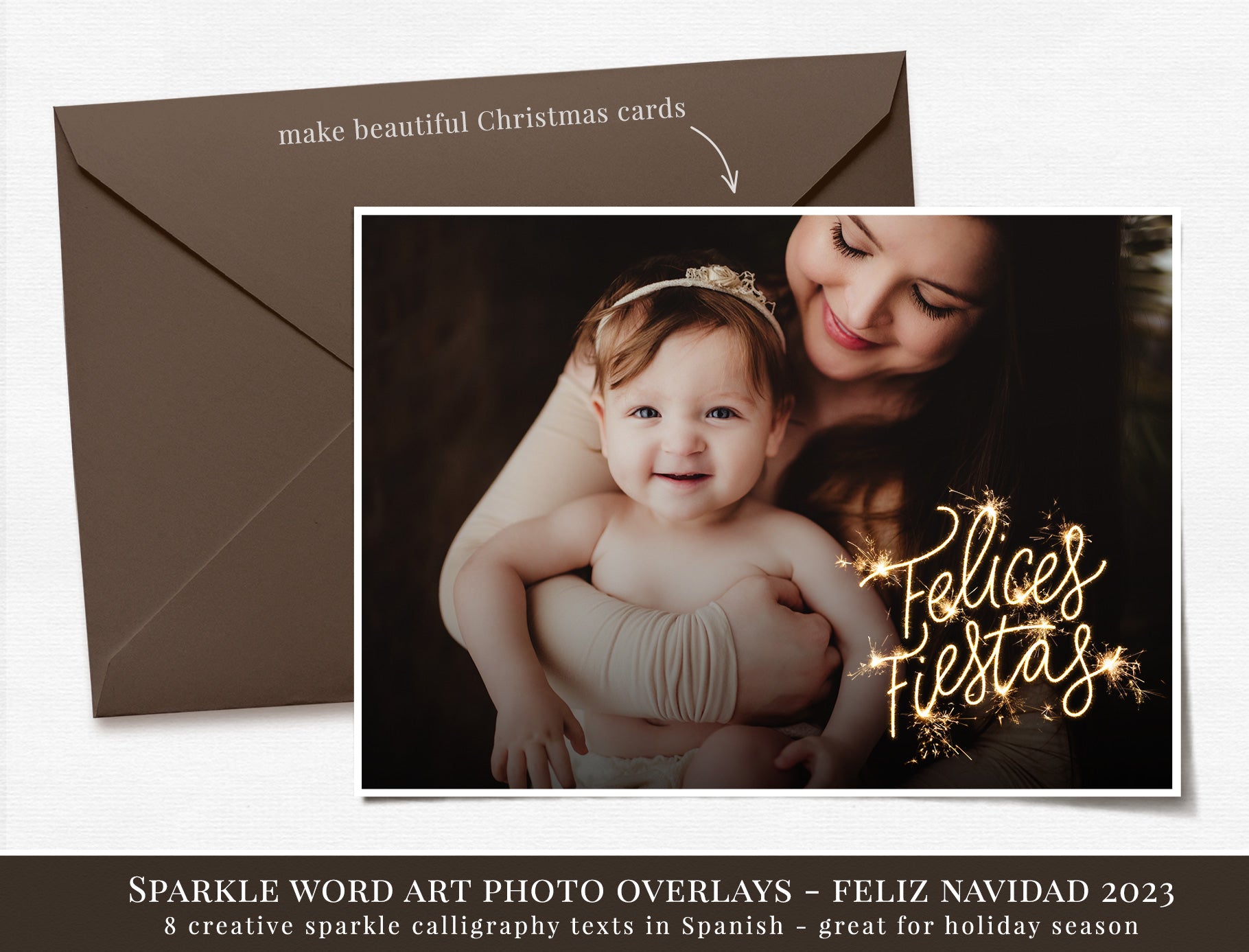 Create festive, warm and joyful holiday images with this beautiful collection of Spanish Christmas sparkle word art photo overlays designed especially for photographers.