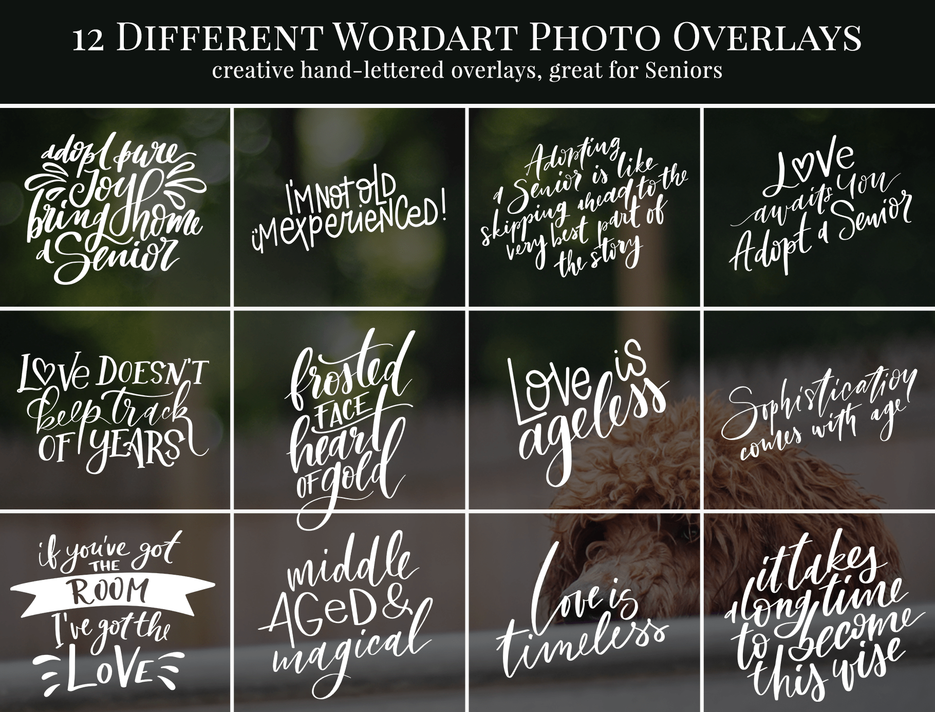 - 12 hand-lettered senior dogs adoption word art overlays