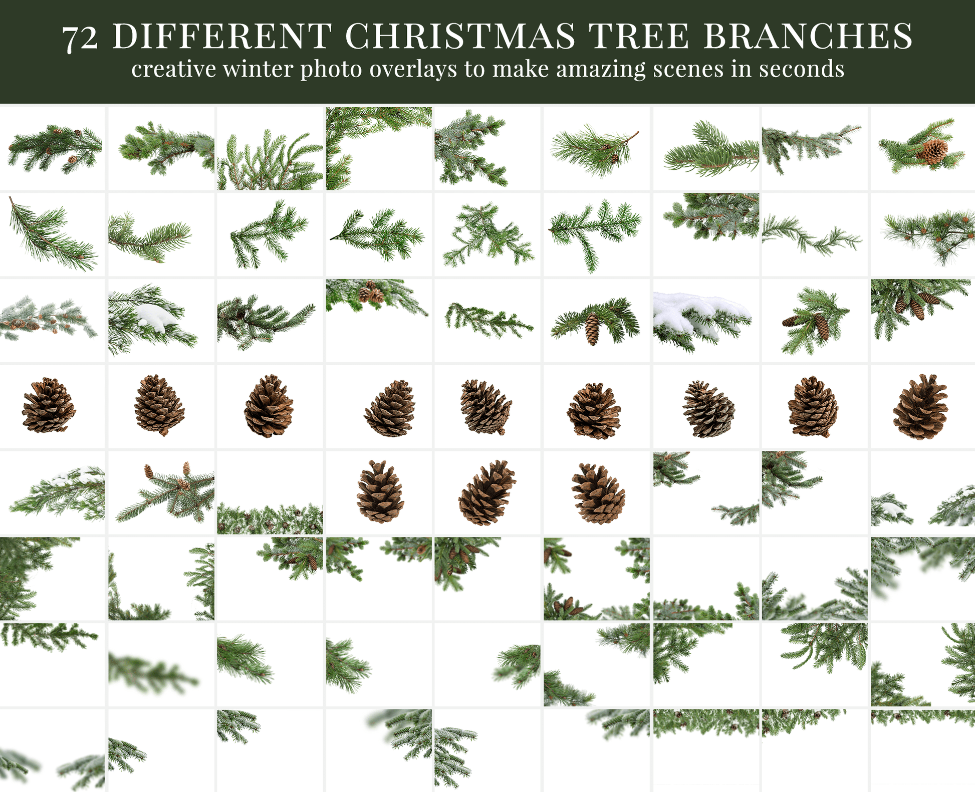 The overlays include branches, pine cones and pre-made scenes, giving you plenty of creative options — from subtle foreground framing to rich layered winter compositions.
