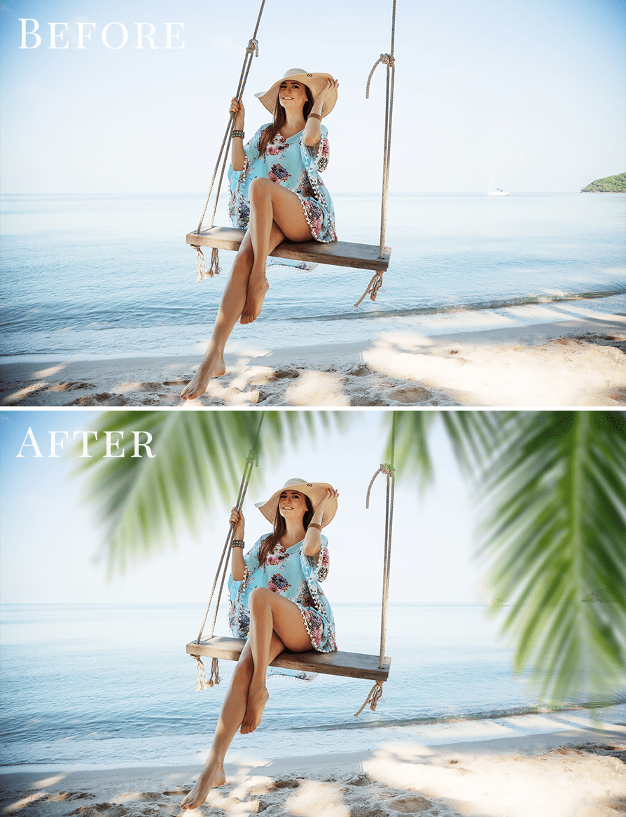 The blurred foreground effect creates the look of shooting through palm leaves, adding depth, softness and a professional feel to your images.