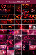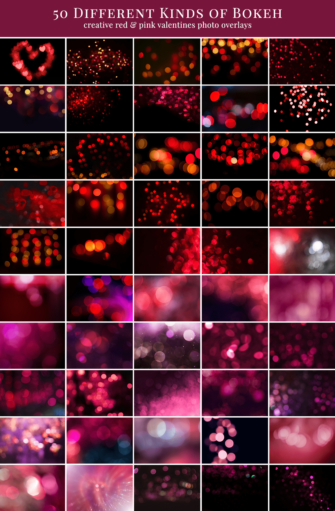 Create soft, romantic and glowing Valentine photos with this collection of 50 red and pink bokeh photo overlays designed especially for photographers.