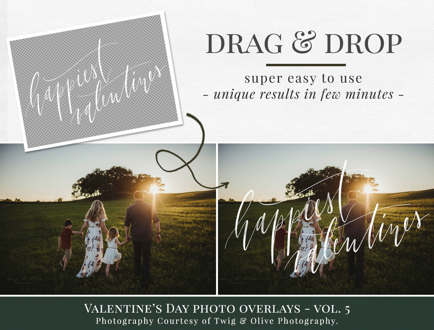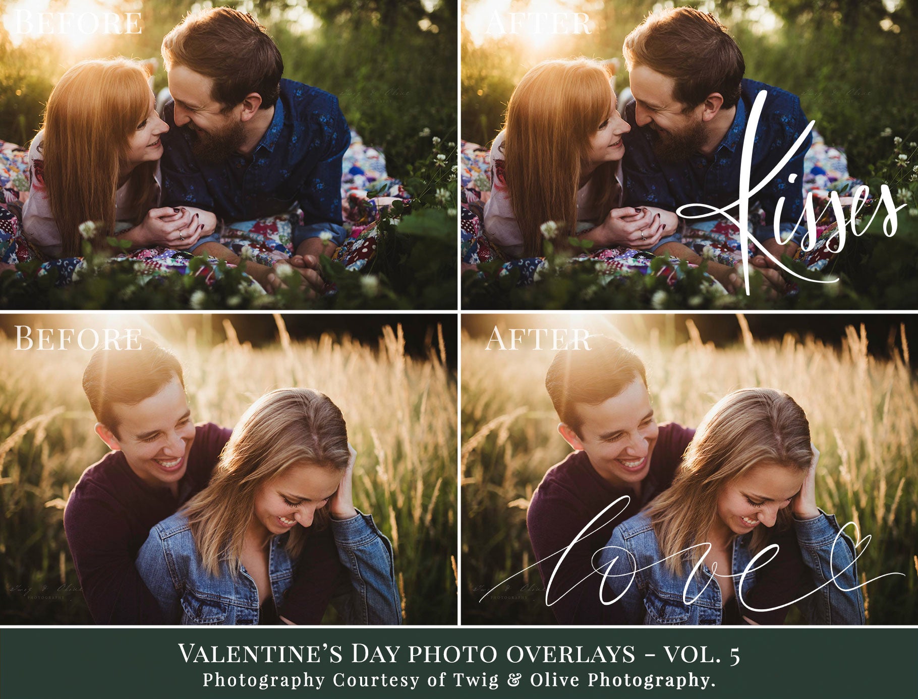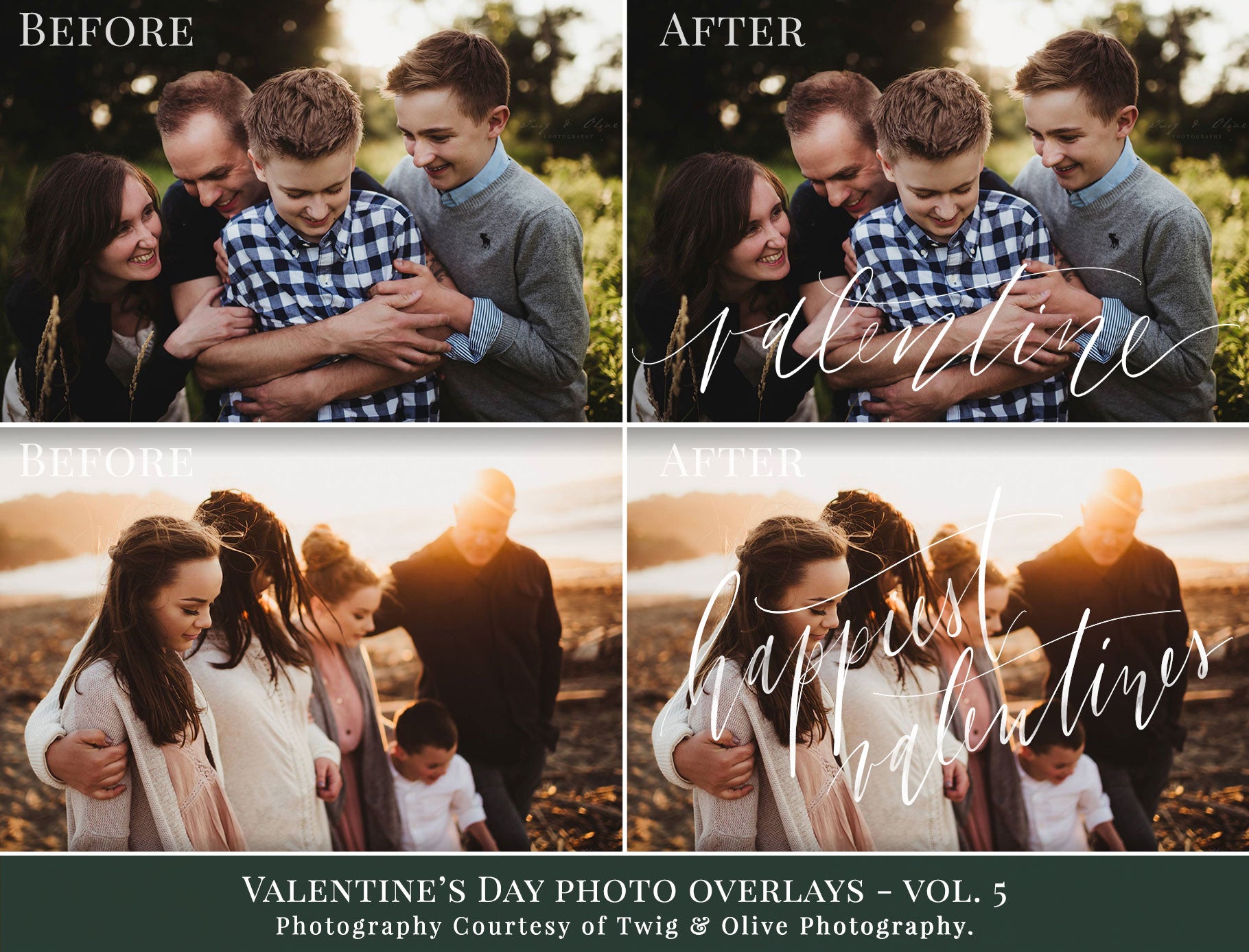 These overlays feature romantic hand-lettered phrases that help you add warmth, feeling and storytelling to your images — perfect for Valentine mini sessions, family photos and couple portraits.