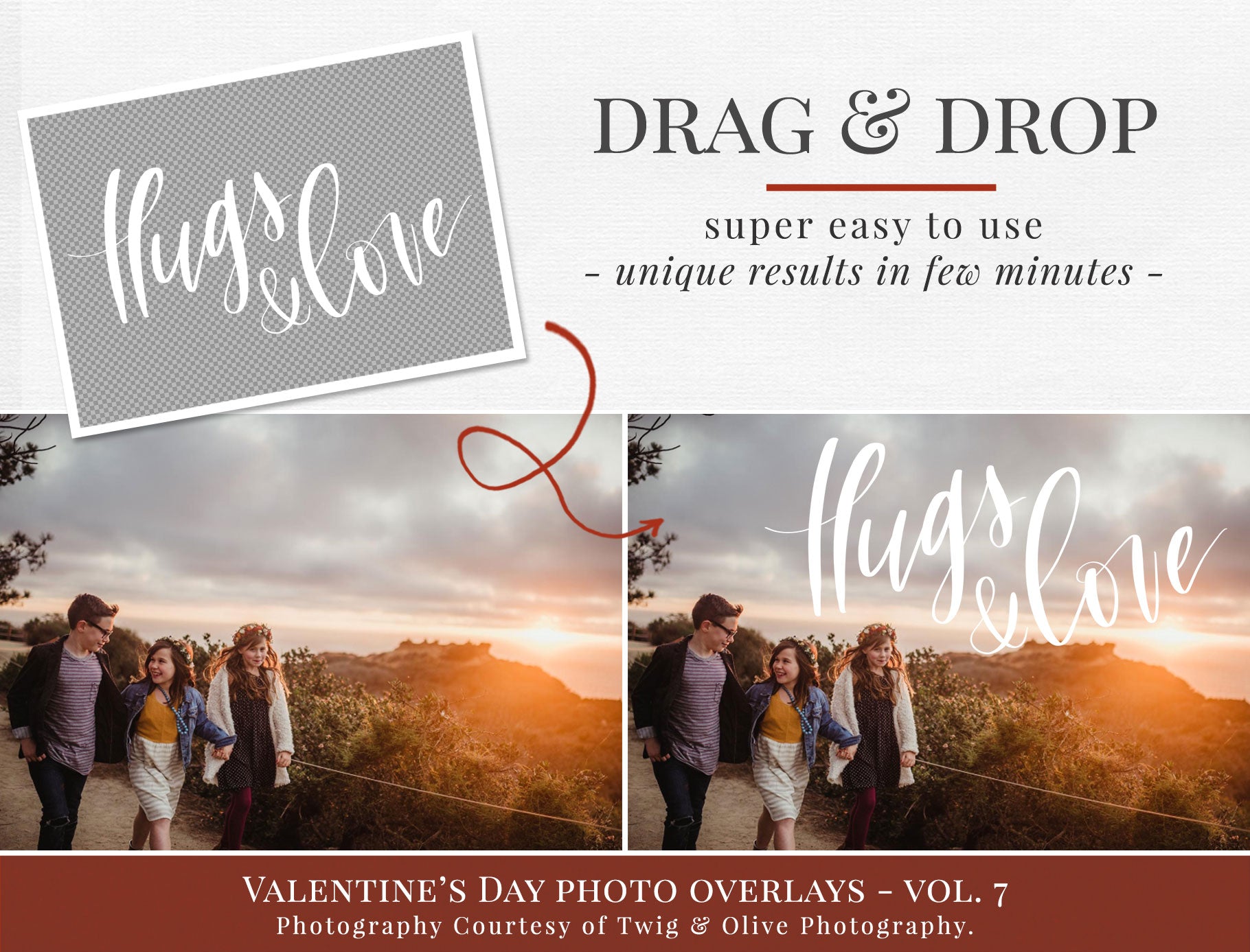 These overlays feature hand-lettered love phrases that help you add emotion, warmth and storytelling to your images — perfect for Valentine mini sessions, family photos and couple portraits.